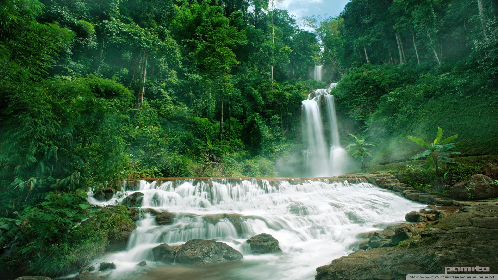 Ogród w którym dominuje zieleń i kwiaty w kolorach białym i fioletowym